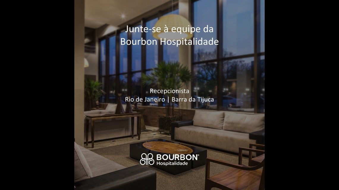 A Bourbon Hospitalidade, uma das empresas líderes no mercado hoteleiro, está buscando um Recepcionista, para o Bourbon Rio de Janeiro, localizado na cidade do Rio de Janeiro - Barra da Tijuca - RJ. Este profissional será responsável por atender ao cliente interno e externo, assegurando o desenvolvimento das atividades inerentes ao setor, dentro dos padrões de qualidade estabelecidos pela empresa, cumprindo as normas e procedimentos internos e externos, bem como obedecendo às políticas gerais da Bourbon Hotéis & Resorts.