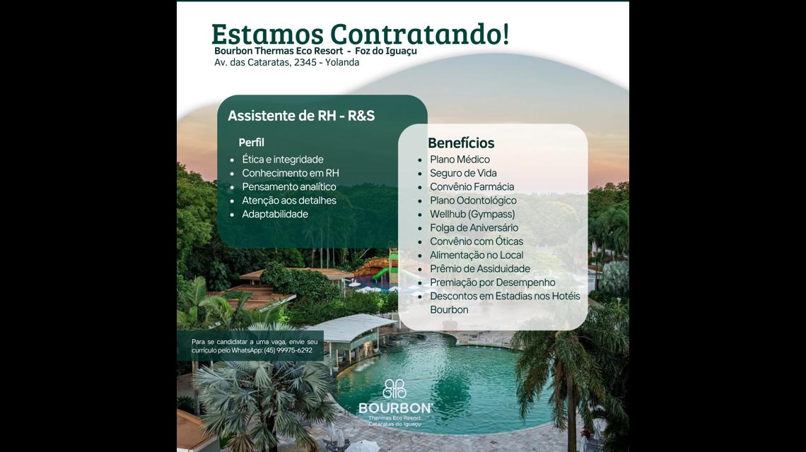 A Bourbon Hospitalidade, uma das empresas líderes no mercado hoteleiro, está buscando uma Assistente de RH para o Bourbon Thermas Eco Resort Cataratas do Iguaçu, localizado na cidade de Foz do Iguaçu - PR. Este profissional será responsável por realizar os processos de Recrutamento e Seleção, atuando desde à divulgação das vagas até o processo de admissão, cumprindo as normas e procedimentos internos e externos, bem como obedecendo às políticas gerais da Bourbon Hotéis & Resorts.